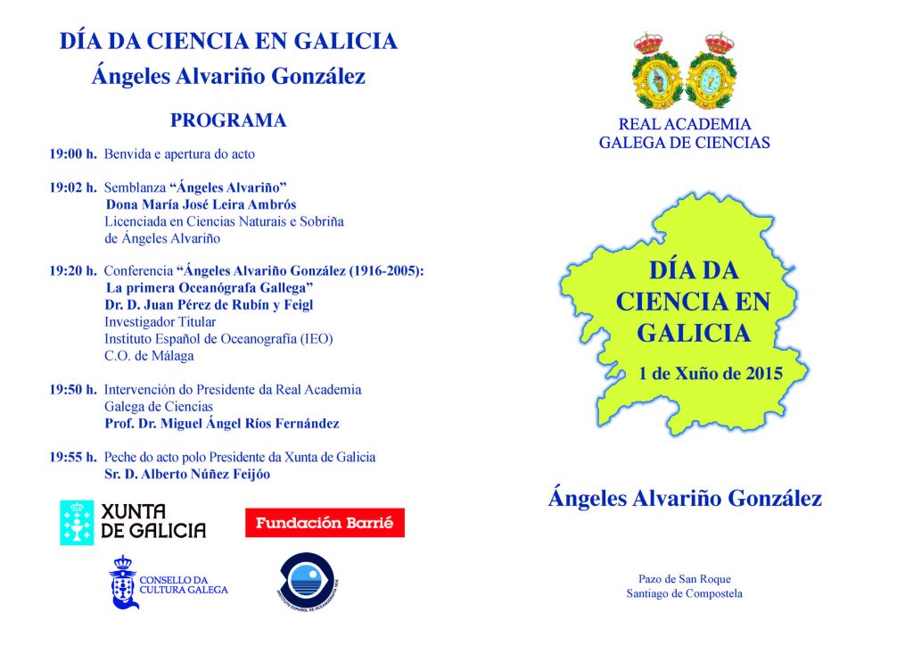 La Real Academia Galega de Ciencias (RAGC) celebró el 1 de junio de 2015, el Día de la Ciencia en Galicia con el homenaje por primera vez a una investigadora mujer, la oceanógrafa Ángeles Alvariño. Esta celebración estuvo promovida por la Real Academia Galega de Ciencias (RAGC) y sustituyó al hasta entonces «Día do Científico Galego». Así, la institución quiso «darle un carácter más abierto y una mayor dimensión». Ángeles Alvariño fue la primera figura femenina que protagonizó ese día, que en ediciones anteriores homenajeó al naturalista Luis Iglesias, al geógrafo Isidro Parga Pondal, al astrónomo Ramón María Aller Ulloa o al humanista Padre Feijóo, entre otros. En 2016, hace unos días, homenajeó al químico Ignacio Ribas Marqués, gallego de adopción.