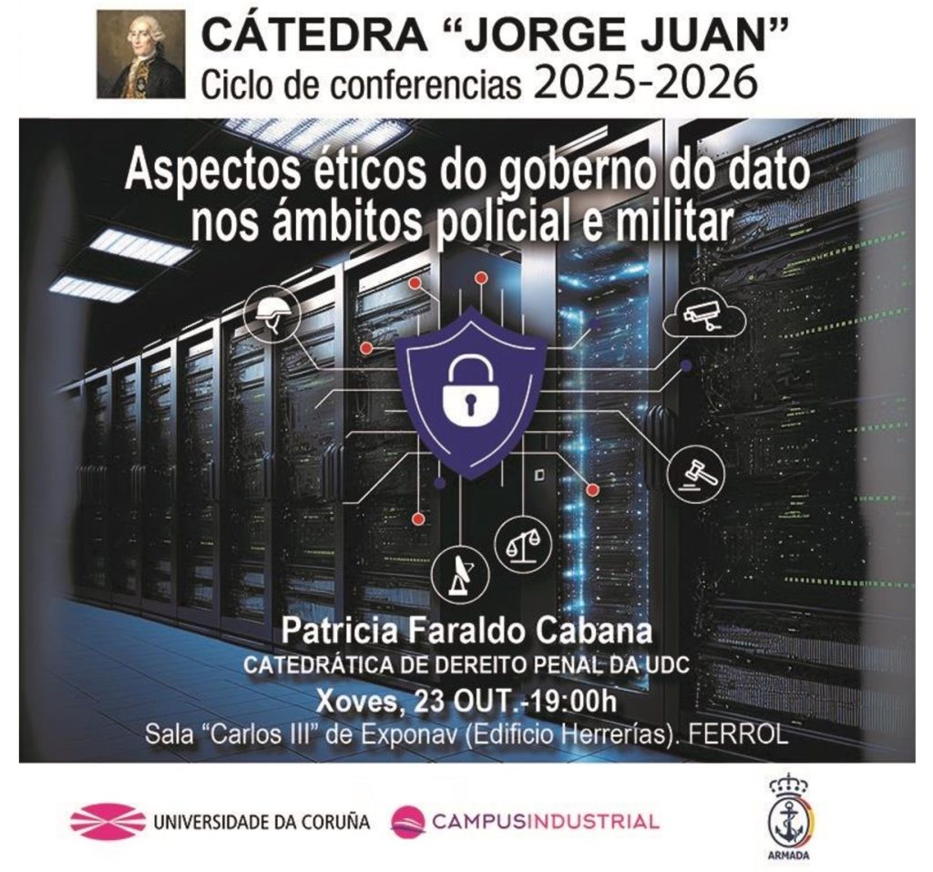 El próximo jueves día 23 de octubre de 2025 a las 19:00 horas, en la Sala Carlos III de la Fundación Exponav. (Museo de la Construcción Naval – Edificio de Herrerías) y dentro del ciclo de conferencias 2025-2026, se impartirá en el ámbito de la Cátedra Jorge Juan, una conferencia titulada: «Aspectos éticos do goberno do dato nos ámbitos policial e militar», a cargo de la catedrática de derecho penal de la UDC Dª Patricia Faraldo Cabana.