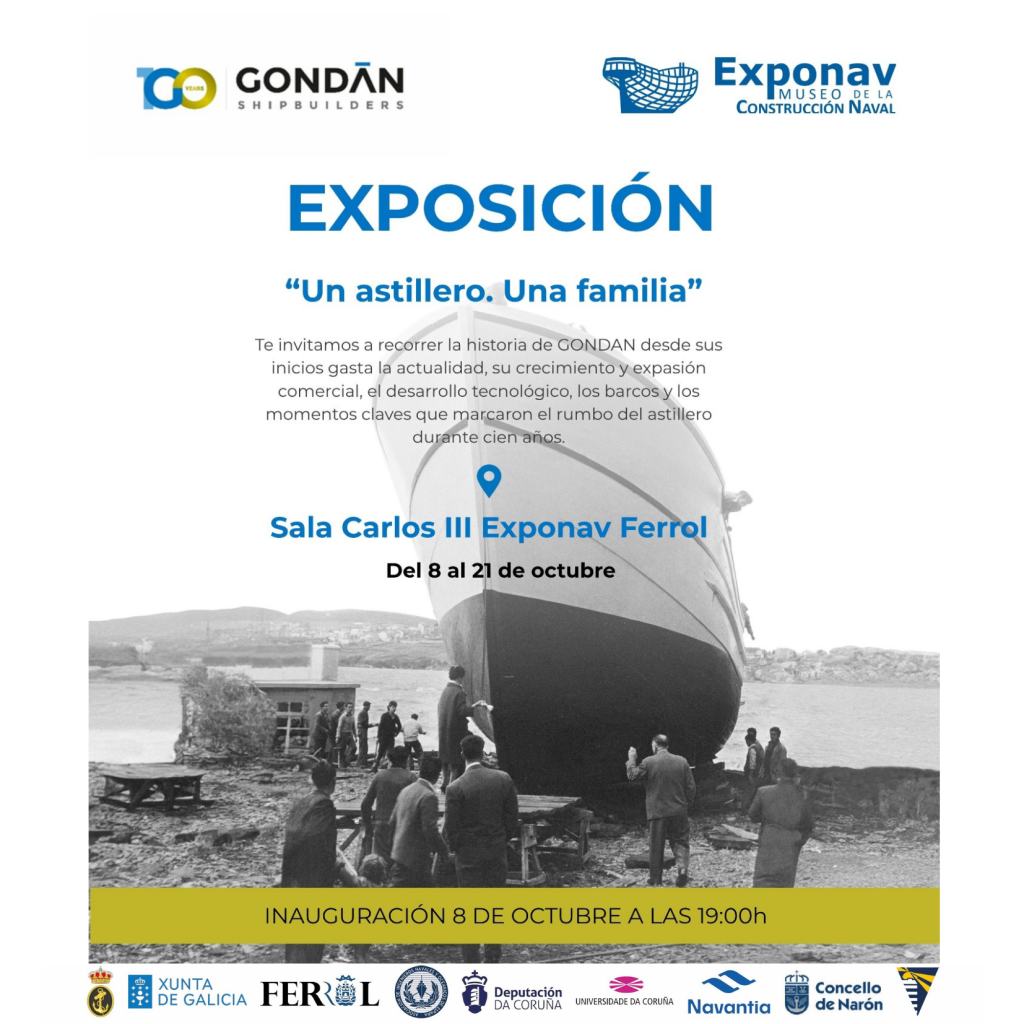 El próximo día 8 de octubre a las 19:00h en la Sala Carlos III de la Fundación Exponav (Centro Cultural Herrerías en Ferrol); tendrá lugar la inauguración de la exposición: «Un astillero. Una familia», la cual recorre la historia de GONDÁN desde sus inicios hasta la actualidad, su crecimiento y expansión comercial, el desarrollo tecnológico, los barcos y los momentos claves que marcaron el rumbo del astillero durante cien años.