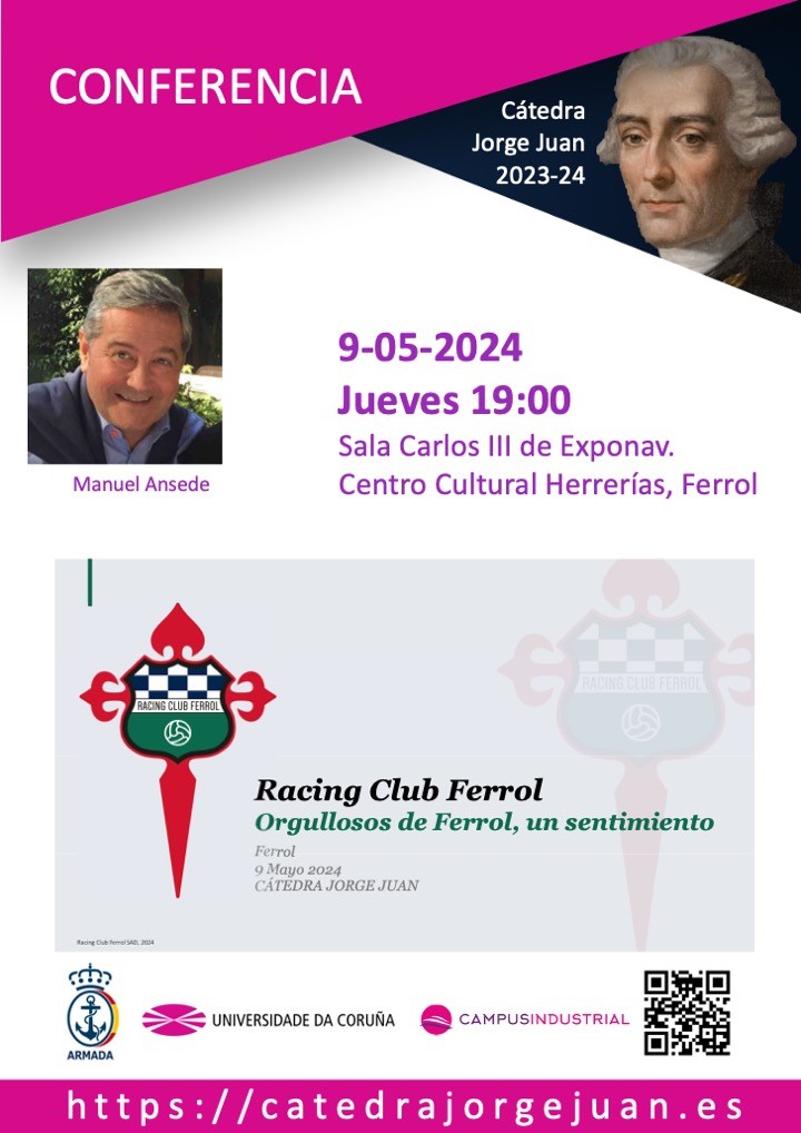 El próximo jueves 9 de mayo de 2024, a las 19:00 Horas en la Sala Carlos III de la Fundación Exponav, Centro Cultural Herrerías en Ferrol, el Presidente del Club deportivo, Manuel Ansede, impartirá en el ámbito de la Cátedra Jorge Juan, la conferencia titulada «Racing Club Ferrol. Orgullosos de Ferrol, un sentimiento».